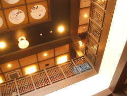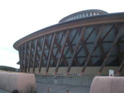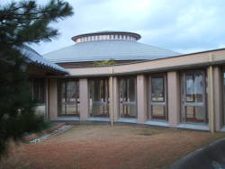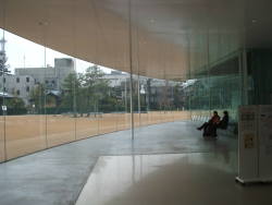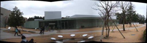 | 建築家妹島和世さんの設計です。全体の形が円形で、外壁はアールのガラス張り。兼六園に隣接して建っています。展示は現代美術で、展示がとてもゆとりをもった感じがしました。展示品より建物に目が行ってしまいますね。あと、来場客が一般的に美術館ではシーンと静まり返るのですが、ここでは皆楽しんでいる様子です。 デジカメでは全体が撮れないため、いくつかにわけて撮ったものをパノラマソフトで自動でつなげました。このソフトは無料でつなぎ目などほとんどわからないし、全自動なのでお勧め。 →ダウンロード autostitchの使い方 |
