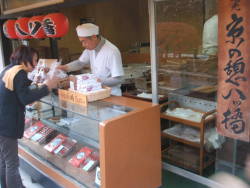 途中に八つ橋を売っているお店があります。洗心橋の近く。「京の憩八ツ橋」 シナモンのとても良い香りがしています。500円の紙袋入りを購入。食してみるとなぜか何枚でも口に入ります。 |