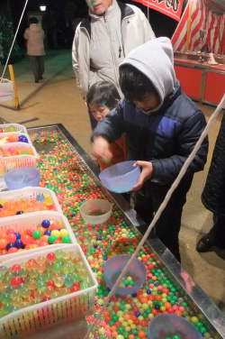 | 子供は、初詣となると屋台が目当て。ここでは、スーパーボールすくい。お店のおばちゃんがとても丁寧にすくい方を教えてくれました。 | |